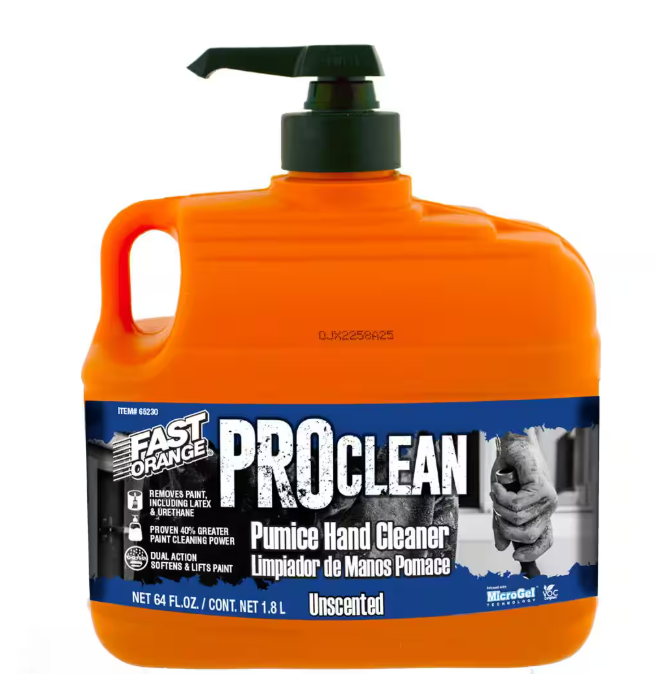 PROClean Hand Cleaner is designed with one unique goal in mind; remove troublesome paint stains and messes from skin. The dual action formula uses pumice which gets into all the creases to break down latex and urethane paints while the patented microgel drills deep into the stain to effortlessly release it from skin. Fast Orange is premium skin conditioners including lanolin, aloe vera and jojoba moisturize dry, cracked hands.