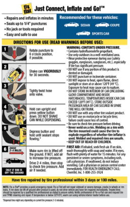 Fix-a-Flat aerosol tire inflators are the easiest and quickest way to repair a flat tire in an emergency. Fix-a-Flat is designed to seal small tire punctures in seconds and provide enough inflation to lift the rim off the ground.