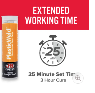 PlasticWeld™ is a hand-mixable, fast-setting epoxy putty that forms a durable bond to most major plastic types. After mixing, it forms a polymer compound that can be molded or used to build up and repair just about anything made from plastic. When cured, it can be sawed, drilled, carved, sanded, and painted. PlasticWeld™ has a 20-25 minute work life; functional cure occurs in 2-3 hours. PlasticWeld™ cures to an off-white color, is rated at a tensile strength of 700 PSI. Does not adhere to polyethylene, polypropylene or some other plastics. Test for adhesion first.