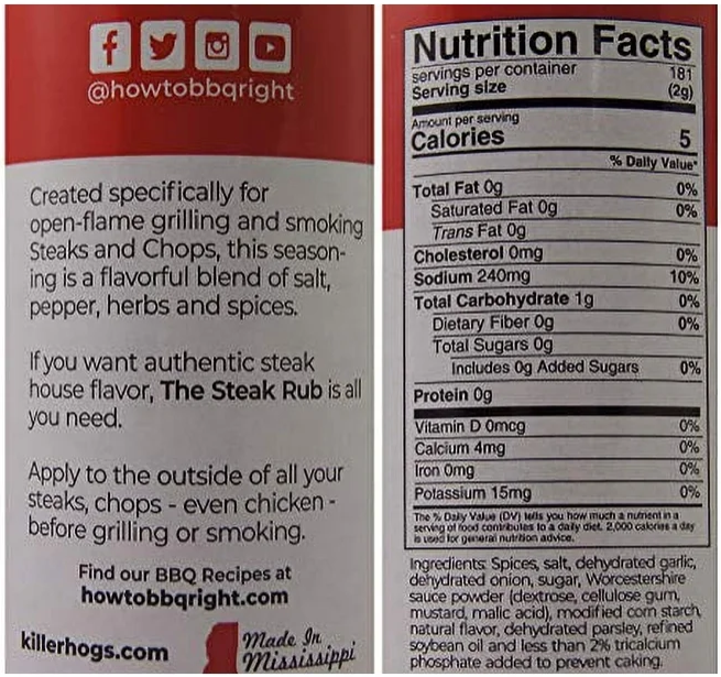 Created specifically for open-flame grilling and smoking steaks and chops, this seasoning is a flavorful blend of salt, pepper, herbs and spices. If you want authentic steak house flavor, The Steak Rub is all you need. Apply to the outside of all your steaks, chops and even chicken, before grilling or smoking. This rub was developed, refined and perfected on the Competition BBQ circuit.