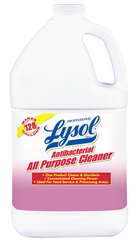 Professional LYSOL Brand Antibacterial All Purpose Cleaner kills E. coli, Salmonella, and Staph, and other bacteria while controlling mold and mildew and counteracting odors. This concentrated formula makes up to 128 gallons of antibacterial solution for light-duty cleaning and sanitizing or up to 64 gallons of solution for heavy-duty cleaning and disinfecting. Safe for use on floors, walls, counters, and equipment in food service areas, Professional LYSOL Brand Antibacterial All Purpose Cleaner is ideal for professional, commercial, and office spaces.