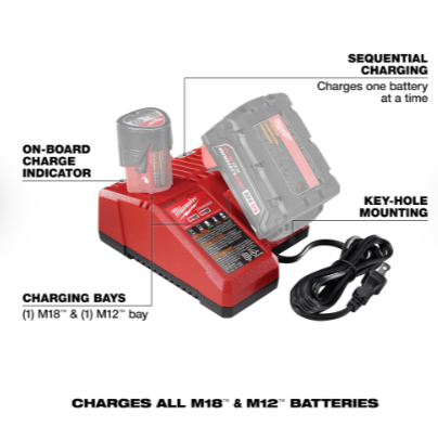 Always be ready for your next job with this cross-system charger. The M18™ & M12™ Multi-Voltage Charger accepts all M18™ and M12™ batteries, so you’ll always be prepared and productive, especially on jobs that require a mix of M12 and M18 Milwaukee cordless power tools. This versatile unit charges batteries sequentially, reducing your time to manage charge cycles. The charger communicates directly with the battery pack to monitor cell voltage, temperature and charge status to ensure a full charge. Power up your Milwaukee compact batteries in 30 minutes and extended capacity batteries in 60 minutes, without the need for extra chargers on the jobsite.