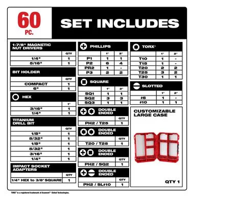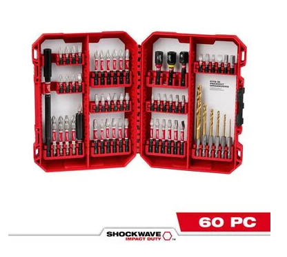 The MILWAUKEE® SHOCKWAVE™ Impact Duty 60PC Drill & Drive Set is engineered to be the Most Durable, Best Fitting Driver Bit Driver Bits on the market. The WEAR GUARD TIP™ delivers increased wear resistance, which protects the impact bit's fit over the life of the bit. The SHOCKZONE™ is optimized for each tip type and length of Driver Bit in the set to absorb peak torque and prevent breaking. The Driver Bit Driver Bits are made from CUSTOM ALLOY76™ steel and a proprietary heat treatment process to extend bit life, providing up to 50X life versus other impact Driver Bit Driver Bits on the market. The MILWAUKEE® SHOCKWAVE™ Impact Duty Driver Bit Driver Bits are built to provide users with extreme durability for the most demanding applications. The set is organized in a customizable accessory case designed for use in PACKOUT™.